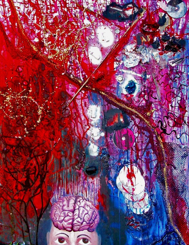 I like this painting. It is an exciting, original and uneasy work. Everything about making it was unusual. I painted/collaged it on the grass in front of my studio and worked long hours without getting tired. My brain was making and helping it. It has been made from old CDs, wires, pieces of wood, plastics, old seeds, screws, nails, nuts, and probably many other things I have forgotten. Here is my brain talking to the world. I made a conscious effort to maintain a high level of spirit and energy while working on it.